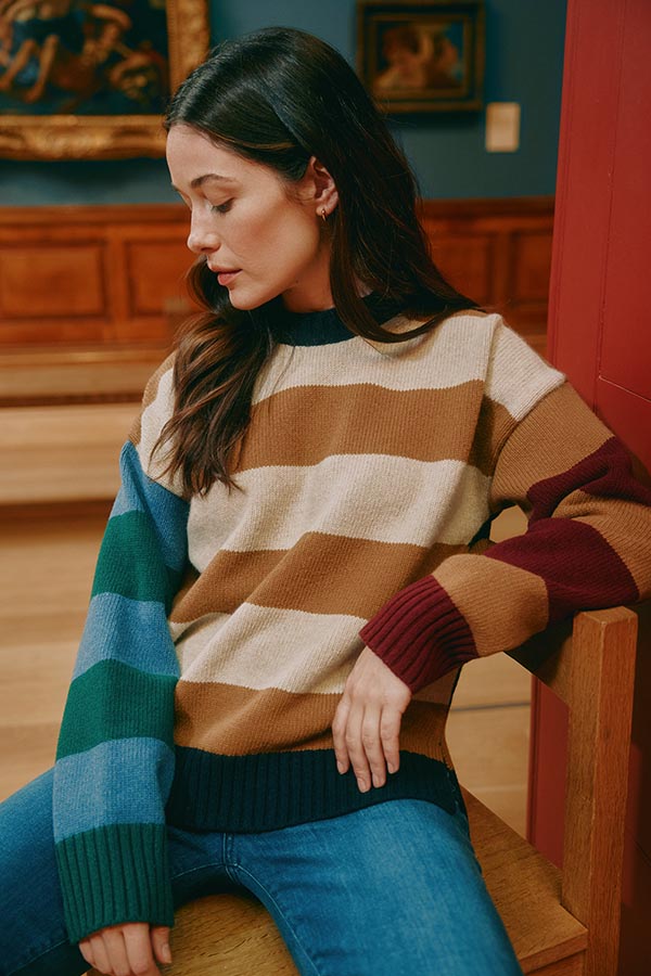 Person wearing a light blue sweater with white stripes and jeans on a neutral background Woman wearing a blue striped sweater and jeans sitting on a stool against a beige background
